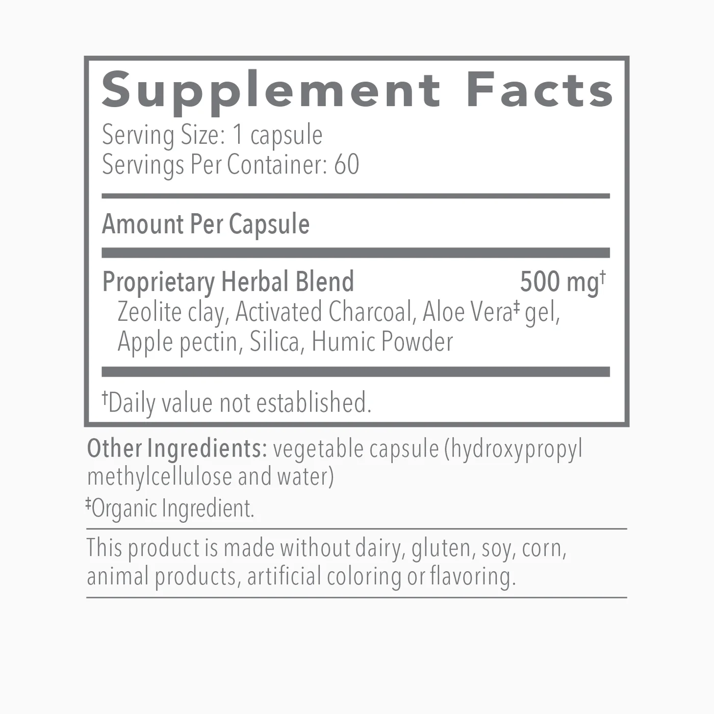 Zeolite clay, Activated Charcoal, Aloe Vera‡ gel, Apple pectin, Silica, Humic Powder.